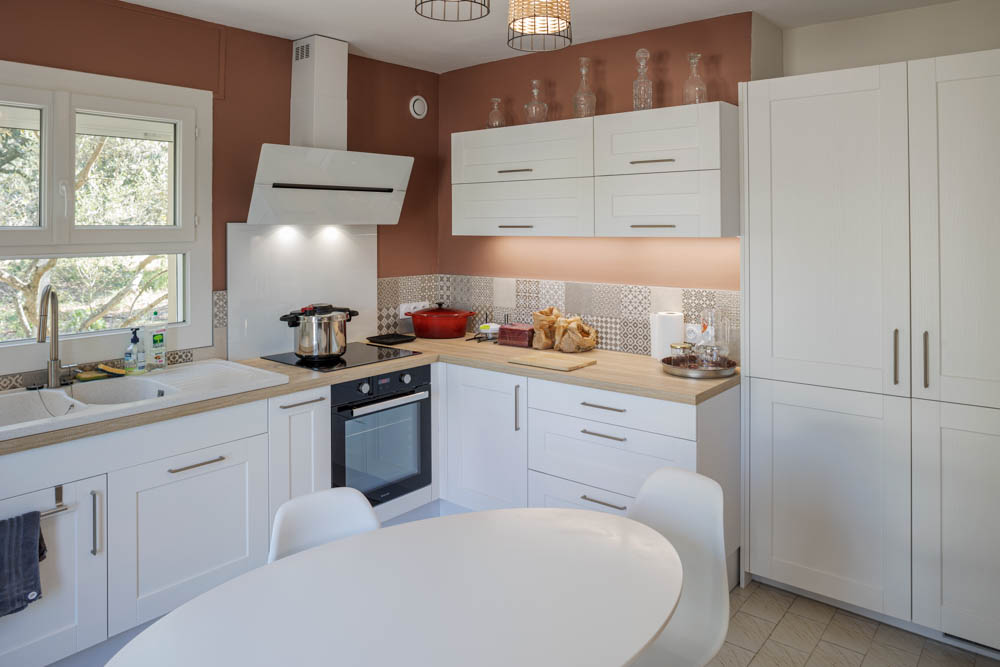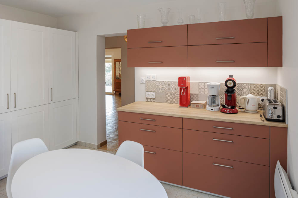 Pratique et fonctionnelle, la cuisine est totalement équipée et permet de cuisiner à plusieurs. Autour d’une table centrale se trouvent de grands plans de travail et de nombreux rangements.