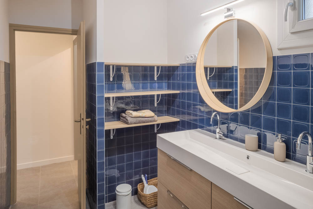 Avec sa douche à l’italienne et sa double vasque, cette salle d’eau pratique et moderne dessert les trois chambres de l’étage. Elle dispose de nombreux rangement et d’un sèche-serviettes.