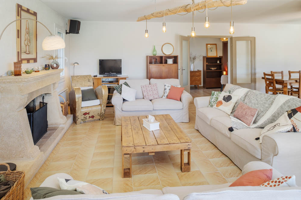 Orienté autour de la cheminée, le salon, chaleureux et lumineux, est équipé de 3 canapés. La table de la salle à manger permet d’installer confortablement 12 personnes.