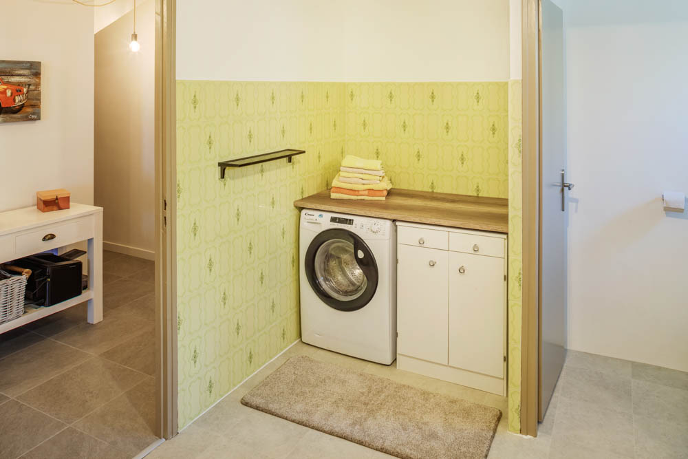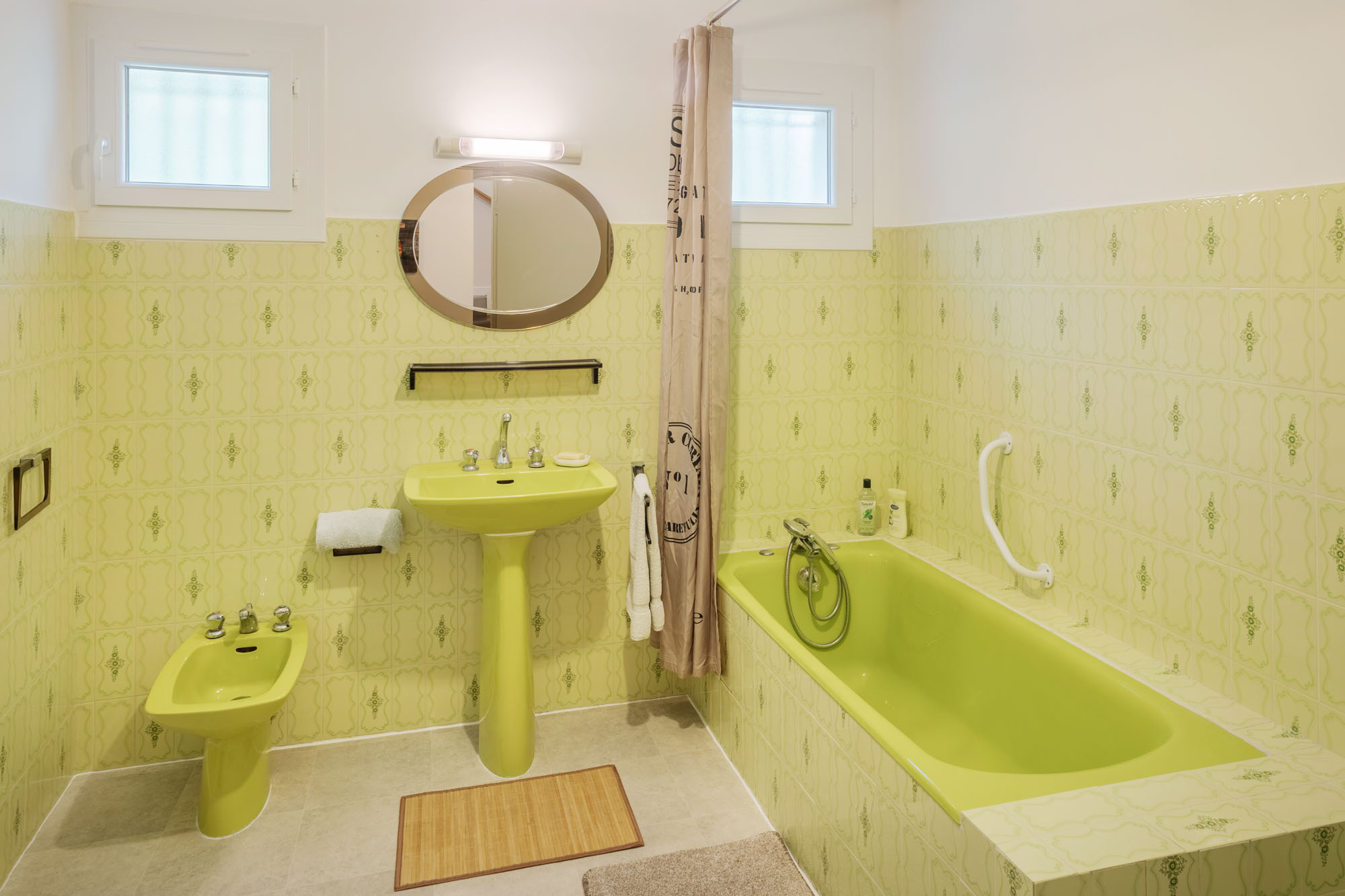 Spacieuse et délicieusement kitch, cette salle de bain dispose d’une baignoire, d’un lavabo, d’un bidet, ainsi que de toilettes séparées. Elle dispose d’un sèche-serviettes et d’un espace buanderie, et est privatisable avec sa chambre attenante.
